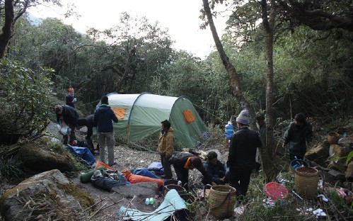 We have breakfast before we clim though dense bamboo forest to Fansipan Mountain Peak. You will have the great experience to stand on the highest peak in Vietnam. You will be rewarded with great views over the valleys of Sa Pa and even see the mountains in Yunan Province in China. Then descend the same way down to 2,800m for camping. Take a rest, make tents, and prepare for dinner with your tourguide and porter.