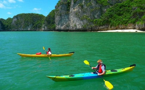 <li>15h00: Kayaking around Dark & Bright cave area which are located under water a millions of years ago & you may even see wild monkeys. This is also the most beautiful lagoon in Lan Ha bay for kayaking activities. If you don't like to do kayaking, you can sit on the sampan boat which is controlled by fisherman to go around.</li>