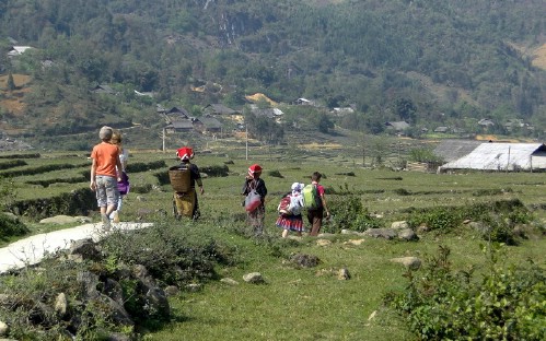 We start 3km of walking down to the south east of Sapa along the side of Muong Hoa valley to Y Linh Ho village of the Black H’mong - visit local school and local houses then continue 4km of trekking down to Lao Chai village of the H’mong.