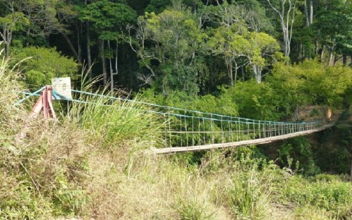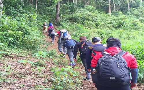 - We cross a river on a wooden platform with barrels for floats and then start our trek upwards the summit of the mountain. The trail climbs gradually but consistently up from 1,300 meters. The first day of trekking is entirely in pine forest.