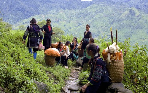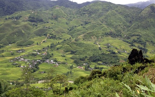 After lunch, we continue moving uphill to Den Thang Mountain in the same trekking trail. This distance takes nearly 1 hour trekking to approach Hang Da village - a Back H'Mong village. This trek brings you the best panorama view of mountainous range, rice terraced paddy fields and villages...like a beautiful peaceful natural painting.