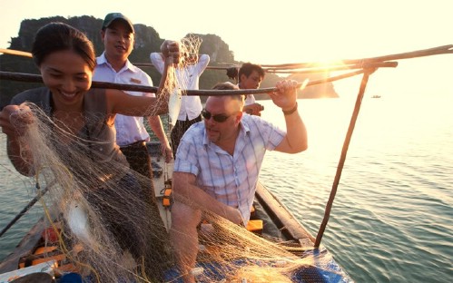 <li>Following the unique route will lead you passing some small beautiful lagoons with some original floating house where we experience the daily life & culture, go catching fishes with nets. If you catch fishes, you & our chef will cook for funny meal. This is amazing activities which only our cruise arranges. Or you can relax & enjoy a calm morning on boat, swimming around the cruise in the emerald water.</li>