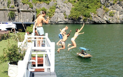 <li>17h00: back to the boat, go up the huge sundeck & enjoy small sunset party with local fruits & tea. You will have chance to jump off from the boat into the emerald water, swimming in free style.</li>