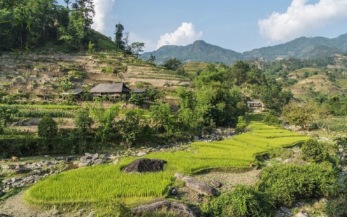 Early breakfast at homestay, at 08:00 AM, we start our morning trek from village to village. We pass through  paddy field s and waterfalls. Then, we walk 30 minutes down to the valley to the Lung Tam commune (altitude difference of roughly 400 m ). Visit the hemp shop in the vilage before having lunch at a local stall.